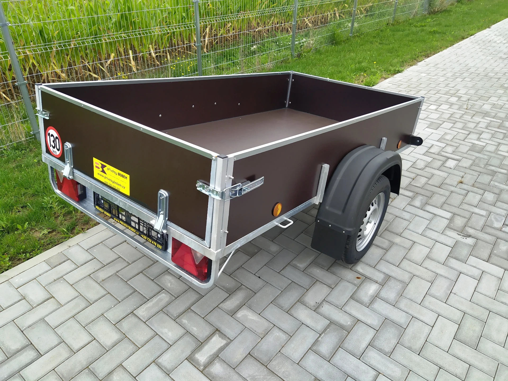 Přívěs s vnějším rozměrem korby 2250x1200 mm. Ložná plocha 2210x1170 mm. Zvýšené bočnice na 350 mm. Celková hmotnost 750 kg, užitečná hmotnost 585 kg. Celkové rozměry 3400x1590 mm