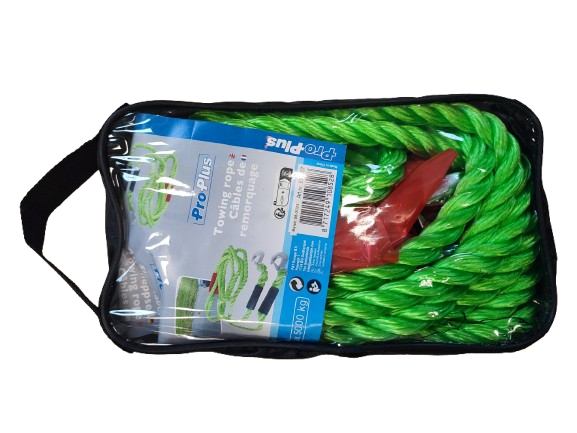 Tažné lano délky 4m, max. okamžitá hmotnost taženého vozu do 5000 kg. Včetně praporku. Kovové háky s pojistkou.
